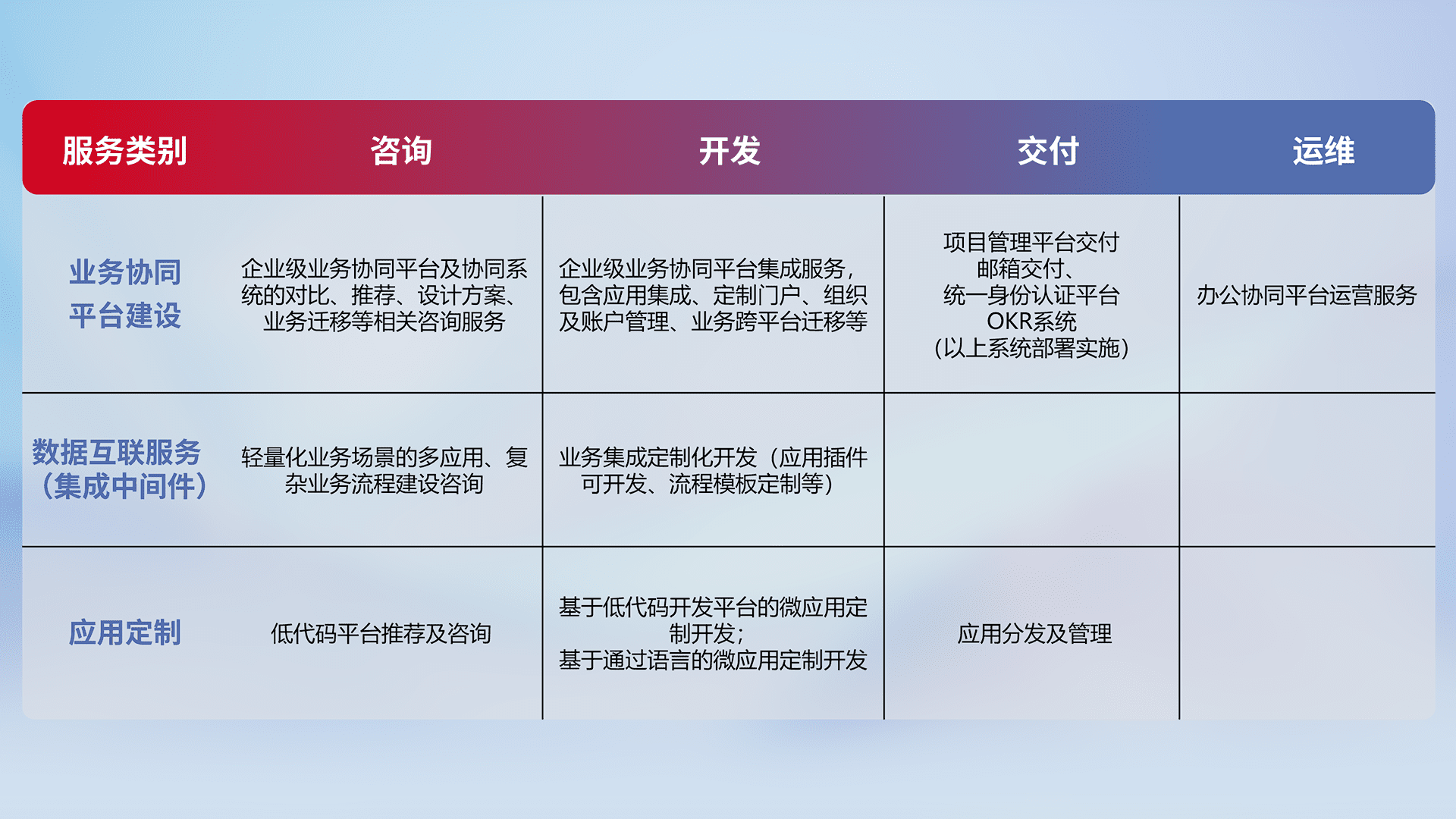 针对钉钉、、、企微、、IDaas等平台级产品提供产品的规划、、、方案、、、交付、、、定制化开发等服务,,,实现如统一协同办公、、、智能客户服务、、混合会议管理、、、智能数据查询、、等业务场景,,,,实现数字化转型。。